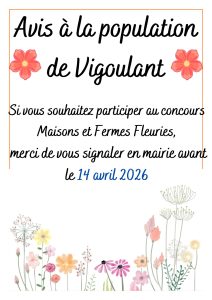 Maisons fleuries Participation au Concours Maisons et Fermes fleuries Pour les habitants de la commune de Vigoulant, si vous souhaitez participer au Concours, merci de bien vouloir vous signaler en mairie. AVANT LE 14 AVRIL 2026